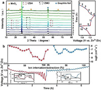 | Fig. 4. (a) Ex situ XRD patterns of VMO-5 cathode in different charge and discharge states. (b) GITT profiles and corresponding diffusion coefficient of H+/Zn2+ for the VMO-5 cathode. | |