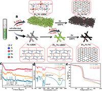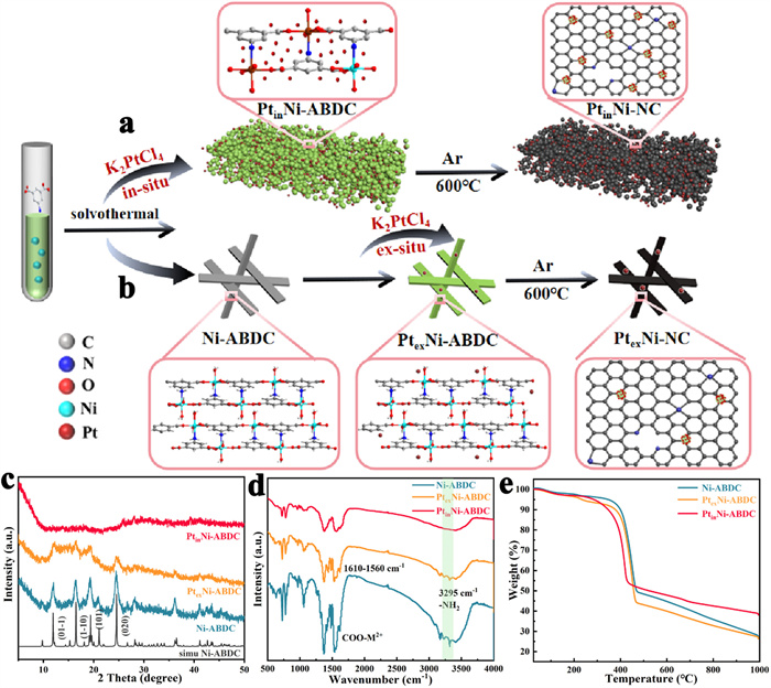 | Fig. 1. (a, b) Two Pt inclusion methods to obtain Pt-doped Ni-ABDC. (c) PXRD patterns, (d) FT-IR spectra, (e) TGA curves of Ni-ABDC, PtinNi-ABDC and PtexNi-ABDC. | |