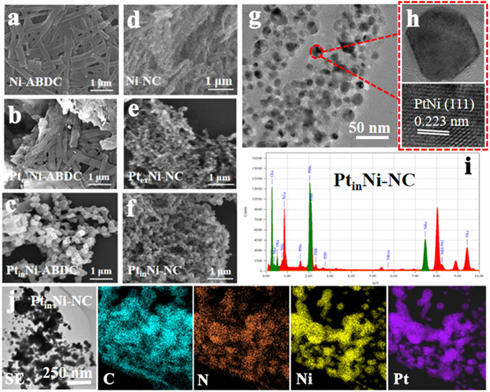| Fig. 2. SEM images of (a) Ni-ABDC, (b) PtexNi-ABDC, (c) PtinNi-ABDC, (d) Ni-NC, (e) PtexNi-NC, (f) PtinNi-NC. (g, h) HRTEM images, (i) EDS pattern, (j) HAADF-STEM and elemental mapping images of PtinNi-NC. | |