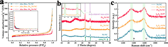 | Fig. 3. (a) N2 isotherms and PSD curves. (b) PXRD patterns. (c) Raman spectra of Ni-NC, PtexNi-NC and PtinNi-NC. | |