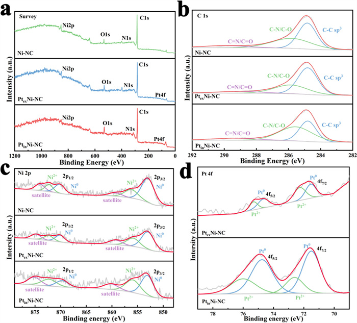 | Fig. 4. (a) Full survey XPS spectra, and the deconvoluted spectra of (b) C 1s, (c) Ni 2p, and (d) Pt 4f of Ni-NC, PtexNi-NC and PtinNi-NC. | |