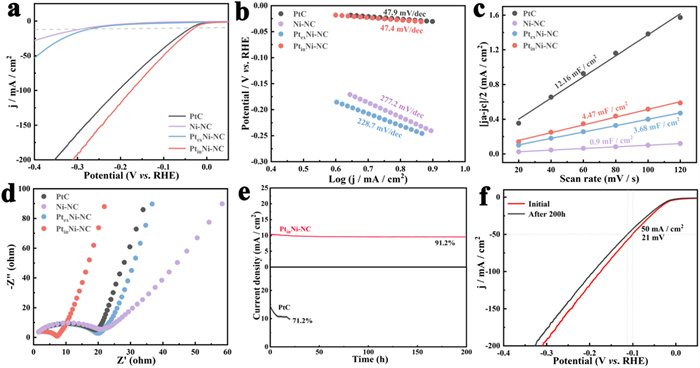 | Fig. 5. (a) LSV curves, (b) Tafel slopes, (c) Cdl profiles and (d) EIS curves of Pt/C, Ni-NC, PtexNi-NC and PtinNi-NC. (e) The i-t stability test, and (f) LSV curves of PtinNi-NC before and after 200 h. | |