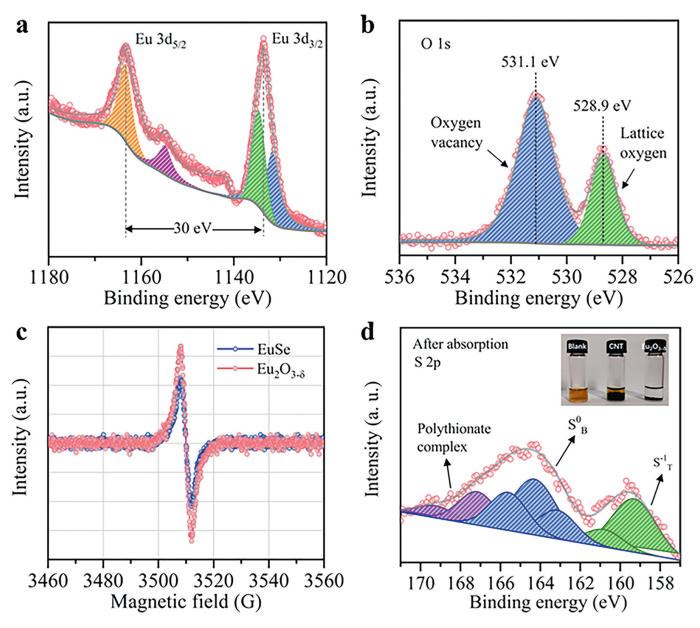 | Fig. 3. High-resolution XPS spectra (a) Eu 3d and (b) O 1s. (c) Electron paramagnetic resonance (EPR) spectra of Eu2O3−δ. (d) Optical photos of CNT and Eu2O3−δ adsorption on LiPSs and XPS spectroscopy of S 2p after Eu2O3−δ adsorption of LiPSs. | |