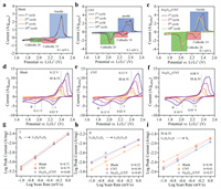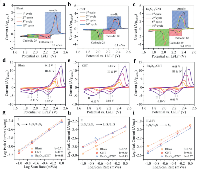 | Fig. 5. (a) CV curves of blank battery under the 1st, 2nd, 5th, and 10th cycles. (b) CV curves of CNT interlayer battery under the 1st, 2nd, 5th, and 10th cycles. (c) CV curves of Eu2O3−δ/CNT interlayer battery under the 1st, 2nd, 5th, and 10th cycles; Under different scanning rates (0.1, 0.2, 0.5, and 1.0 mV/s), the (d) blank battery (e) CNT interlayer battery and (f) Eu2O3−δ/CNT interlayer battery, as shown in Plot of the logarithm of current peak versus logarithm of scan rate at (g) Ⅰ, (h) Ⅱ and (i) Ⅲ & Ⅳ. | |
