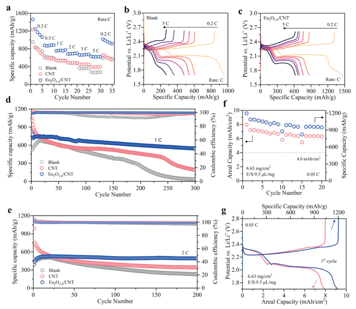 | Fig. 6. (a) Rate cycle performance of different LSBs. (b) Charge and discharge curve of blank battery at 0.2–5 C. (c) Charge and discharge curve of Eu2O3−δ/CNT interlayer battery at 0.2–5 C. (d) Long cycle charge and discharge test of different batteries at 1 C. (e) Cyclic charge and discharge test of different batteries at high rate 2 C. (f) Charge-discharge cycle test of Eu2O3−δ/CNT interlayer under 6.63 mg/cm2 high loading. (g) First charge-discharge curve at 0.05 C under 6.63 mg/cm2. | |
