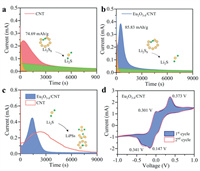| Fig. 4. (a) Li2S deposition curve of CNT interlayer. (b) Li2S deposition curve of Eu2O3−δ/CNT interlayer. (c) Decomposition curves of Li2S in different interlayers. (d) CV curve of Li2S6 symmetrical battery of Eu2O3−δ/CNT interlayer. | |