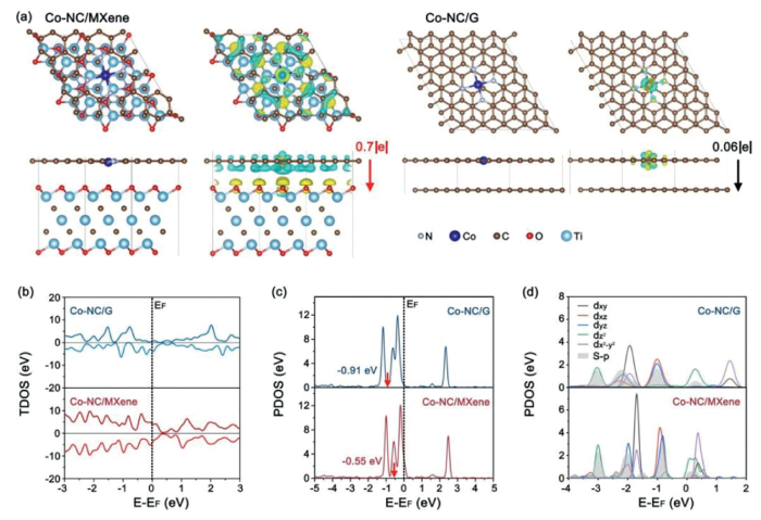 | Fig. 1. Theoretical analyses of the electronic structure of the catalysts and their interactions with polysulfides. (a) Optimized geometric structure of Co-NC/MXene and Co-NC/G, and the corresponding CDD as the front view, where cyan and yellow colors represent the depletion and accumulation of electron densities, respectively (isosurfaces: 0.001 e/bohr3). (b) TDOS of Co-NC layer in Co-NC/G and Co-NC/MXene. (c) PDOS of Co-d orbitals for different structure, the red arrow and black solid line represent the positions of d-band center and Fermi level (EF), respectively. (d) PDOS of Co-d and S-p states after Li2S interacting with Co-NC/G and Co-NC/MXene. | |