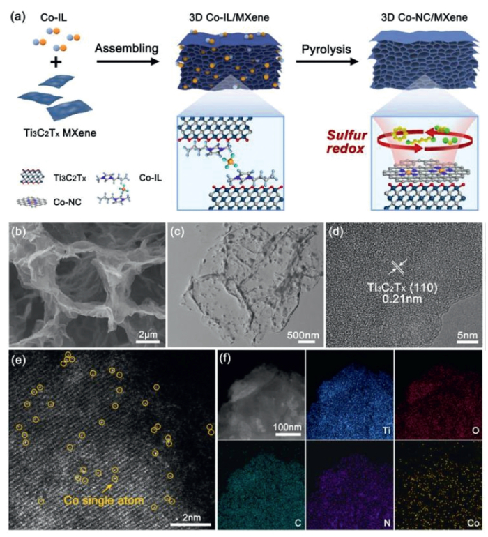 | Fig. 2. The synthesis and representative electron microscopy images of 3D Co-NC/MXene. (a) Schematic of synthesis, (b) SEM image, (c) TEM image, (d) high-resolution TEM image, and (e) the aberration-corrected HAADF-STEM of Co-NC/MXene. (f) HAADF-STEM image and color mapping show the distribution of Ti, O, C, N, Co element, respectively. | |