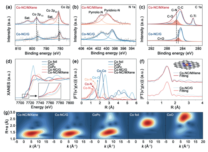 | Fig. 3. Structural characterizations of 3D Co-NC/MXene. XPS spectra of (a) Co 2p, (b) N 1s and (c) C 1s for Co-NC/MXene and Co-NC/G. (d) Co K-edge XANES spectra and (e) corresponding k3-weighted FT of EXAFS spectra. (f) Fitting curves of the EXAFS in R-space and optimized coordination configuration of Co-NC/MXene and Co-NC/G. (g) WT for k3-weighted EXAFS signals at Co K-edge. | |