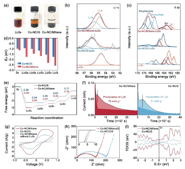 | Fig. 4. Interaction of 3D Co-NC/MXene catalyst with LiPSs and electrocatalytic SRR activity. (a) Photograph of the samples soaked in a Li2S6/DOL/DME solution after 8 h, XPS spectra of (b) Li 1s and (c) S 1s for Li2S6-absorbed Co-NC/MXene. (d) The calculated adsorption energy (Ea) of various Li2Sn (n = 1, 2, 4, 6 and 8) and S8 species on Co-NC/G and Co-NC/MXene. (e) Free energy diagram for the conversion of LiPSs on Co-NC/G and Co-NC/MXene. (f) Li2S deposition profile. (g) CV curves of Li2S6 symmetric cells using different active materials. (h) EIS spectra of LSBs based on Co-NC/G/S and Co-NC/MXene/S cathodes. (i) TDOS of Co-NC/G and Co-NC/MXene models. | |
