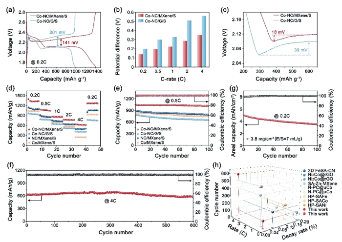 | Fig. 5. Electrochemical performances of the Co-NC/MXene/S cell. (a) Charge/discharge curves at 0.2 C of Co-NC/MXene and Co-NC/G based sulfur cathodes. (b) Potential difference between the anodic and cathodic scan at different C rates. (c) Magnified discharge curves showing the overpotential of Li2S nucleation. (d) Rate capability and (e) cycling stability at 0.5 C of Co-NC/MXene, Co-NC/G, NC/MXene and Co/MXene based sulfur cathodes. (f) Long-term cycling stability of Co-NC/MXene based sulfur cathodes at 4 C. (g) Cycling performance of Co-NC/MXene based sulfur cathodes with an increased sulfur loading of 3.8 mg/cm2. (h) Comparison of the stability of Co-NC/MXene with reported sulfur cathodes based on metal single atoms (1 C = 1675 mA/g). | |