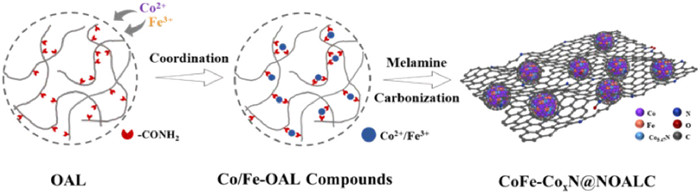 The schematic diagram (Fig. 1) illustrated methods to prepare CoFe-CoxN@NOALC. Amide groups were incorporated to enhance the metal ion chelation capability and water solubility of lignin. The modified lignin and metal ions were homogeneously stirred and blended in an aqueous solution, leading to the formation of Co/Fe-OAL compounds through pH adjustment. The catalyst was obtained by carbonizing a mixture of Co/Fe-OAL compounds and melamine. The modified lignin served as an organic framework for chelating and dispersing metal ions, additionally providing a carbon source during the carbonization process.