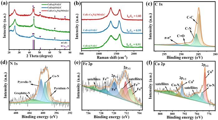 | Fig. 2. Comparison of different catalyst. (a) X-ray diffraction pattern. (b) Raman spectra and XPS spectra of CoFe-CoxN@NOALC (c) C 1s, (d) N 1s, (e) Fe 2p, (f) Co 2p. | |