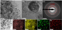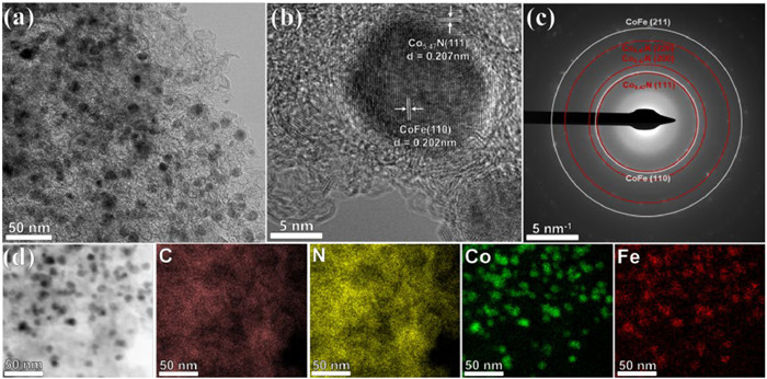 | Fig. 3. Morphological investigations of CoFe-CoxN@NOALC. (a) TEM image. (b) HR-TEM image, (c) SAED pattern, and (d) HAADF-STEM image and the corresponding EDS mapping of C, N, Co, Fe. | |
