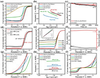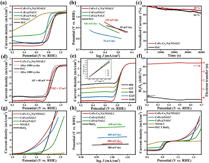 | Fig. 4. Bifunctional ORR and OER activity of CoFe-CoxN@NOALC. (a) ORR polarization curves (rotation rate: 1600 rpm; scan rate 5 mV/s). (b) Tafel plots for ORR. (c) Chronoamperometric responses of CoFe-CoxN@NOALC and Pt/C catalysts at a fixed potential. (d) ORR polarization curves (before and after durability tests). (e) ORR polarization cures at different rotation speeds (400-1600 rpm). The inset shows the corresponding Koutecky-Levich plot at various potentials. (f) Electron transfer number (n) and peroxide yield (%). (g) OER polarization curves. (h) Tafel plots for OER. (i) Overall polarization curves within the ORR and OER potential window. | |