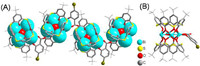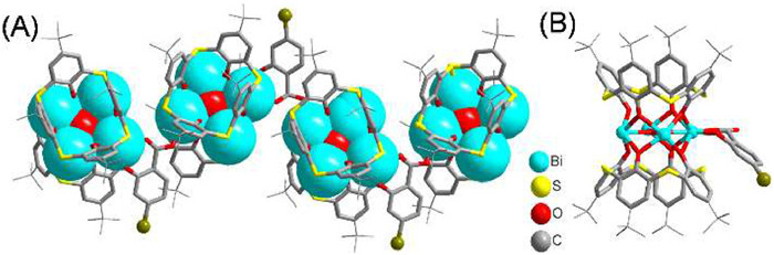 | Fig. 3. Crystal structures of Bi4-Sal cluster. (A) The overall polymeric structure of Bi4-Sal. (B) The sandwich-type {Bi4O(TC4A)2} unit. Hydrogen atoms are removed for clarity. | |
