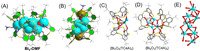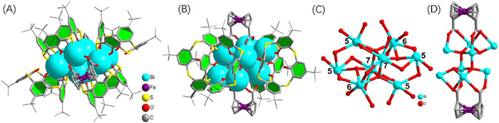 | Fig. 4. Crystal structures of Bi8-Fc nanocluster. (A, B) The overall structure of Bi8-Fc from different perspectives. (C) The Bi8O4 core (Numbers represent the coordination number of each Bi atom). (D) The coordination mode of the ferrocene carboxylate. Hydrogen atoms are removed for clarity. | |