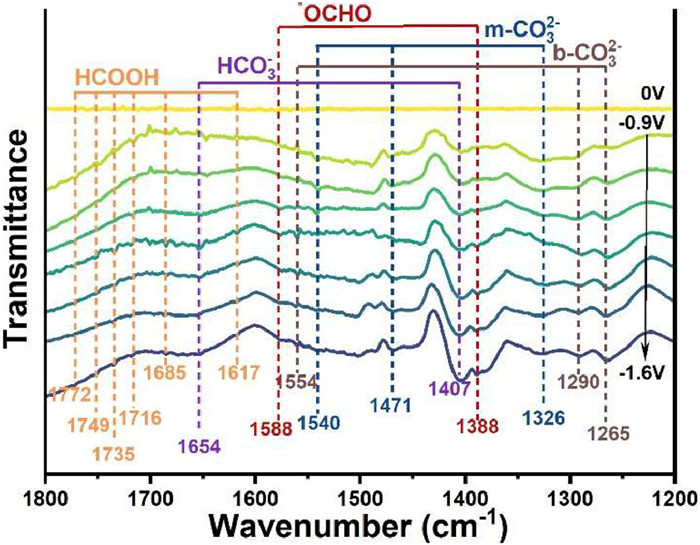 The eCO2RR mechanism mediated by Bi-based materials unfolds through consecutive stages initiated by chemisorption of CO2 onto catalytic active sites, followed by proton-coupled electron transfer (PCET) processes that generate key intermediates. The reaction pathway progresses through sequential transformations, beginning with the formation of *OCHO intermediates through initial PCET activation, followed by their conversion into adsorbed HCOOH species via subsequent proton-electron transfer steps, and ultimately culminating in the desorption of final products from the catalyst surface. To unravel this reaction network, we conducted in situ electrochemical attenuated total reflection Fourier-transform infrared spectroscopy (ATR-FTIR) measurements across a potential window from −0.9 V to −1.6 V vs. RHE (Fig. 7). When employing Bi8-DMF as the electrocatalyst, many characteristic spectral regions revealed voltage-dependent evolution of critical intermediates. As illustrated in Fig. 8, the peaks appear at 1326, 1471 and 1540 cm−1 attributed to the stretching vibration of m-CO32−, and at 1265, 1290 and 1560 cm−1 belonging to the stretching vibration of b-CO32− [44]. The bands at 1407 and 1654 cm−1 in the spectra are attributed to HCO3− [34]. Most importantly, the *OCHO intermediate signals detected at 1388 and 1588 cm−1 are generally regarded as key intermediates in the electrochemical CO2/HCOOH conversion and increase gradually with the applied potentials varying between −0.9 V and −1.6 V. Besides, the characteristic peaks of HCOO− (1617, 1685, 1716, 1735, 1735, and 1772 cm−1) start to appear with increasing voltage.
