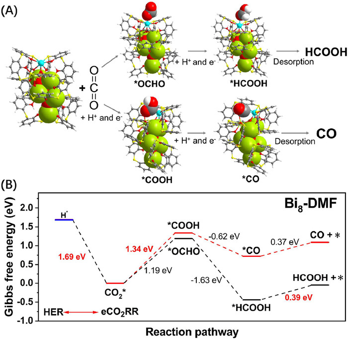 | Fig. 8. (A) Schematic diagram of the eCO2RR process on Bi8-DMF. (B) Free energy diagrams for the eCO2RR and HER on Bi8-DMF. | |
