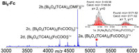 We further examined the behavior of the Bi8-Fc cluster in solution using ESI-MS (Fig. 5). The spectrum revealed four distinct peaks corresponding to ligand dissociation processes: (1) A prominent +2 charged peak at m/z = 5149.56 aligns with the theoretical m/z = 5149.64 for [H2Bi8O4(TC4A)4(FcCOO)2]2+, confirming the intact cluster structure; (2) The +1 charged species at m/z = 4702.63 (observed; calcd. 4702.74) corresponds to [H4NaBi8O4(TC4A)4(DMF)]⁺, indicating partial loss of two FcCOO⁻ ligands; (3) A neutral cluster at m/z = 4464.29 (observed; calcd. 4464.65) assigned to [H2Bi8O4(TC4A)3(FcCOO)2(MeOH)] demonstrates removal of one TC4A ligand with methanol coordination; (4) The species at m/z = 4277.32 (observed; calcd. 4277.67), identified as [Na2Bi8O4(TC4A)3(FcCOO)(DMF)], reveals simultaneous loss of one TC4A and one FcCOO⁻ ligand. These sequential ligand dissociation events contrast sharply with the complete core rearrangement observed in Bi8-DMF, suggesting that Bi8-Fc maintains its central Bi8O4 framework while undergoing controlled ligand shedding. This partial ligand loss with core preservation highlights the enhanced stability imparted by dual-ligand coordination in Bi8-Fc compared to the single-ligand-protected Bi8-DMF system.