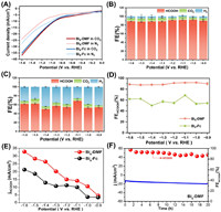 | Fig. 6. (A) LSV of samples in N2 or CO2 saturated 0.5 mol/L KHCO3 solution. (B) FE values of Bi8-DMF at different voltages. (C) FE values of Bi8-Fc at different voltages. (D) FEHCOOH comparison between Bi8-DMF and Bi8-Fc. (E) jHCOOH comparison between Bi8-DMF and Bi8-Fc. (F) Current density and FEHCOOH of Bi8-DMF during long-time electrolysis at −1.0 V (vs. RHE). | |