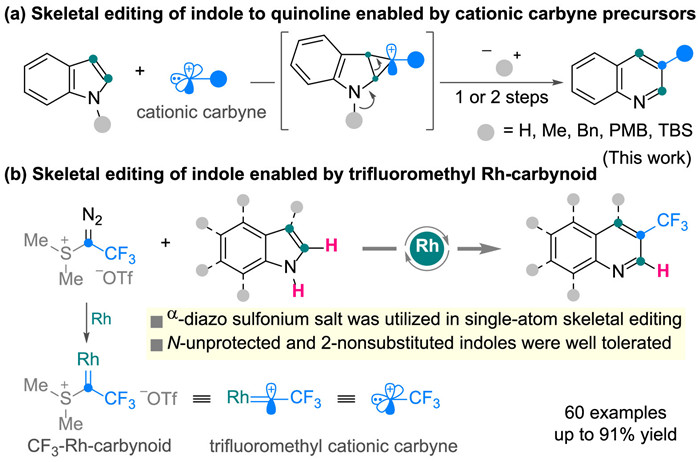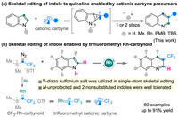 In summary, Han et al. have developed an indole-quinoline transmutation using α-diazo sulfonium salt as a cationic carbyne precursor via a rhodium-catalyzed [2 + 1] cycloaddition and intramolecular rearrangement cascade. DFT calculations further supported the proposed single-atom insertion and ring expansion pathways, suggesting that the mechanism presumably proceeds via the electrophilic cycloaddition of a formal trifluoromethyl Rh-carbynoid to indole, yielding an endo-cyclopropane intermediate. Given that both N-unprotected and 2-nonsubstituted indoles were well tolerated in this reaction, this one-step procedure holds significant application prospects in the fields of organic synthesis and medicinal chemistry.