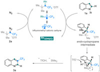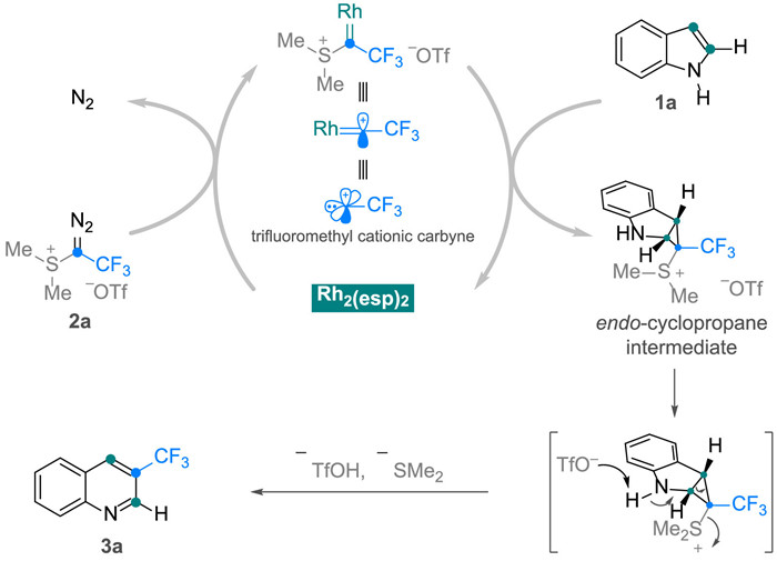 The authors proposed that the trifluoromethyl Rh-carbynoid (CF3C+=Rh), a trifluoromethyl cationic carbyne (CF3C+: ) equivalent, in situ generated from α-diazotrifluoroethyl sulfonium salt 2a and dirhodium complex Rh2(esp)2 would be engaged in the skeletal editing of indole 1a by single-carbon atom insertion into the C2(sp2)-C3(sp2) bond to yield the endo-cyclopropane intermediate, which further gives 3-trifluoromethylquinoline 3a via a TfO--promoted aromatization-driven rearrangement process (Scheme 2).