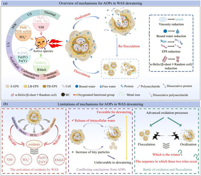 | Fig. 1. Overview of mechanisms for AOPs in WAS dewatering (a) and limitations of mechanisms for AOPs in WAS dewatering (b). | |