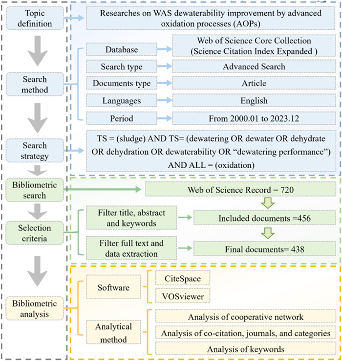 | Fig. 3. Technical flow graph for bibliometric analysis of AOPs-based WAS dewatering research. | |