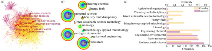 | Fig. 4. (a) The visualization mapping of journals co-citation network, (b) frequency and centrality of categories in AOPs-based WAS dewatering research field, and (c) co-occurrence network of categories in AOPs-based WAS dewatering research field. In graph (c), larger node indicated higher frequency of category, and the color closer to gray in the central of node indicated earlier occurrence of the category. | |