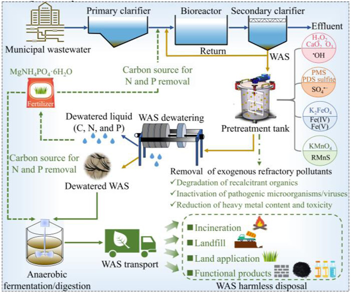 Based on the discussion above, an integrated plan for the harmless disposal of AOPs-treated WAS was proposed (Fig. 6). The plan used AOPs as the pretreatment process for WAS, which could simultaneously realize the removal of ERPs from WAS and the improvement of WAS dewatering performance. It can realize the resourceful and harmless treatment and disposal of WAS, meanwhile reducing the external emission of WWTPs, which provides an effective and competitive plan for the reform of traditional WAS management plan.
