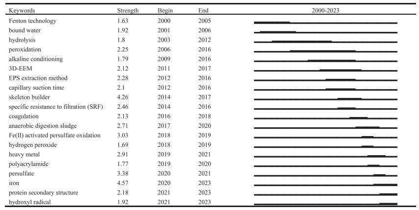 4.4.3. Citation burst analysis for keywords related to AOPs-based WAS dewateringThe citation burst identifies keywords that proliferate in a brief time, which reveals research trends and hotspots [16]. In the research field of AOPs-based WAS dewatering, the 20 strongest citation burst keywords were obtained and categorized into 6 groups (Table 2). The keywords in the first group were associated with AOPs, such as "Fenton technology", "peroxidation", "Fe(Ⅱ) activated persulfate oxidation", "hydrogen peroxide", "persulfate", "iron", and "hydroxyl radical". This indicated that AOPs used for WAS dewatering researches have been continuously updated during the last 23 years, with a gradual development from the initial Fenton process to the later persulfate-based process and the current •OH-based AOPs. The keywords in the second group were associated with dewatering mechanism, including "bound water", "3D-EEM", "EPS extraction method", and "protein secondary structure". This suggested that the analysis of WAS dewatering mechanisms was progressively shifting from the floc and cellular level to the molecular level. The keywords in the third group were "hydrolysis", "alkaline conditioning", "skeleton builder", "coagulation", and "polyacrylamide", which were physicochemical processes frequently combined with AOPs. This indicated that in the research field of AOPs-based WAS dewatering, researchers were initially more concerned with the destruction of WAS flocs while later more concerned with the reconstruction of WAS flocs. The keywords in the fourth group were "capillary suction time" and "specific resistance to filtration (SRF)", which were the evaluation indexes of WAS dewaterability. The fifth group, "anaerobic digestion sludge", demonstrated that digestate dewatering after WAS anaerobic digestion has also received attention. The sixth group, "heavy metal", related to post-treatment of dewatered WAS, indicating that research on WAS dewatering based on AOPs has begun to focus on the impact of AOPs on the subsequent treatment process of WAS, rather than merely focusing on WAS dewatering itself. Furthermore, the citation burst analysis of keywords showed that "iron", "protein secondary structure", and "hydroxyl radical" are the current research hotspots in the field of AOPs-based WAS dewatering and may be the future research hotspots as well.