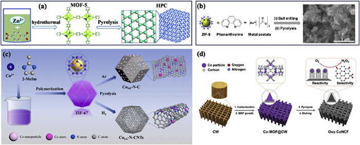 | Fig. 1. Schematic diagram of (a) HPC preparation, (b) the M−N−C catalysts (M = Co, Ni, Fe, Cu, and Mn), and SEM image of the Co−N−C catalyst, (c) CoSA−N−CNTs and CoNP−N−C catalysts preparation and (d) the oxo CoNCF catalysts preparation. Reproduced with permission [36,44,45,47]. Copyright 2015, Wiley; 2019, American Chemical Society and 2022, Elsevier, respectively. | |
