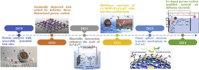3. Design of MOFs derivatives for 3e− ORRFig. 2 illustrated the development timeline of MOFs−derived electrocatalysts. In 2019, Liu et al. [48] used calcined MOFs anchored on porous carbon monolithic substrates, which ensured that potential Fe sites both available for •OH generation. It marked the first instance of a MOFs−derived electrocatalyst with a nanoconfinement applied to the 3e− ORR in water treatment. Subsequently, in 2020, Cao et al. [49] demonstrated that atomically−dispersed Fe sites within defective three−dimensional porous carbon exhibited a 59-folds improvement in the elimination of refractory toxic pollutants compared to nanoparticulate iron oxides. The introduction of bimetals such as Fe/Ce, Fe/Cu, Fe/Co, and Fe/Mn into porous carbon has since become a research hotspot, enhancing the Fe(Ⅲ)/Fe(Ⅱ) cycle in the 3e− ORR [50-53]. In 2022, Su et al. [54] reported that the confinement between the interface of Ce-MOFs and Fe3O4@C facilitated O2 adsorption at the ORR fountainhead, thereby reducing the required external potential. Following this, the integration of nanoconfinement and bimetallic strategies was further developed [55]. To enhance the efficiency of MOFs derivatives in promoting the 3e− ORR, various strategies should be explored, such as loading substrates like natural air diffusion electrodes or binding with other carbon materials like carbon aerogel [56,57].