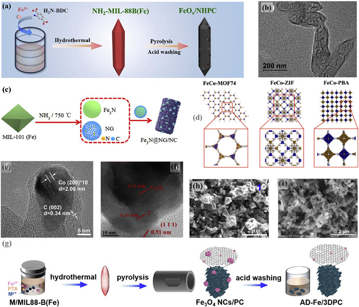 | Fig. 4. (a) Schematic diagram of FeOX/NHPC preparation and its (b) TEM images. Reproduced with permission [74]. Copyright 2020, Elsevier. (c) Schematic diagram of Fe3N@NG/NC preparation. Reproduced with permission [65]. Copyright 2021, Elsevier. (d) MOFs precursors of Fe/Co ions (FeCo−ZIF, FeCo−MOF74 and FeCo−PBA) complexed with different linkers (MeIM, DHTA and cyanide). Reproduced with permission [55]. Copyright 2023, Elsevier. (e) TEM images of Co@N−C. Reproduced with permission [76]. Copyright 2018, Elsevier. (f) HRTEM image of Ce−MOFs/Fe3O4@C. Reproduced with permission [54]. Copyright 2022, Elsevier. (g) Schematic diagram of AD−Fe/3DPC preparation. SEM images of Cu/MIL−88B(Fe) precursor pyrolysis products (h) without acid washing and (i) with acid washing. Reproduced with permission [49]. Copyright 2020, American Chemical Society. | |