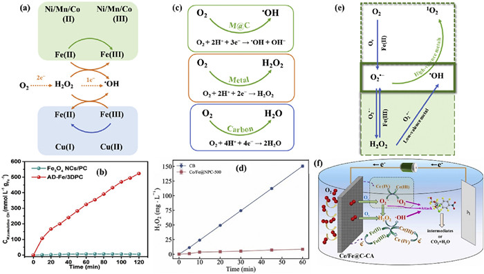 | Fig. 5. (a) The strategy of promotion of cycle of Fe(Ⅲ)/Fe(Ⅱ) to generate to •OH. (b) Mass activity in •OH productivity of AD−Fe/3DPC and Fe3O4 NCs/PC catalytic systems. Reproduced with permission [49]. Copyright 2020, American Chemical Society. (c) The scheme of direct conversion of O2 to •OH via 3e− ORR. (d) The H2O2 accumulation with Co/Fe@NPC cathodes. Reproduced with permission [64]. Copyright 2023, Elsevier. (e) The scheme of interaction between •OH and O2•−. (f) Schematic mechanism of Ce/Fe@C in heterogeneous EF. Reproduced with permission [57]. Copyright 2024, Elsevier. | |