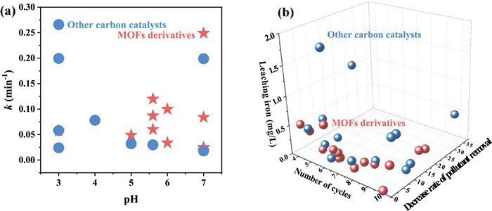| Fig. 6. (a) Comparison of k value of pollutants removal at different pH of MOFs derivatives in Table 1 and other carbon−based materials as 3e− ORR electrocatalysts in the literature. (b) Comparison of cycles number, decrease in pollutant removal efficiency and leaching iron concentration of MOFs derivatives in Table 1 and other carbon−based materials as 3e− ORR electrocatalysts in the literatures [10,11,58,78,112,117-124]. | |
