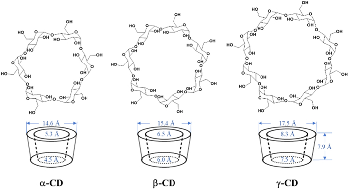 2. Structural characteristics of CDsCDs are natural cyclic oligosaccharides with a hydrophobic inner cavity and hydrophilic outer surface, consisting of glucose units connected by 1,4-glycosidic linkages. They were discovered in the enzymatic degraded products of starch in 1891 [22]. They were reported as "cyclic polysaccharides" in 1911 [23] and defined as "cyclodextrin" in 1949 [24]. After that, the natural CDs were separated, and their inclusion complexes were reported [25].
