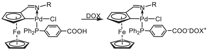 | Scheme 12. Molecular structure of cyclopalladated ferrocene compound and its DOX salt. | |