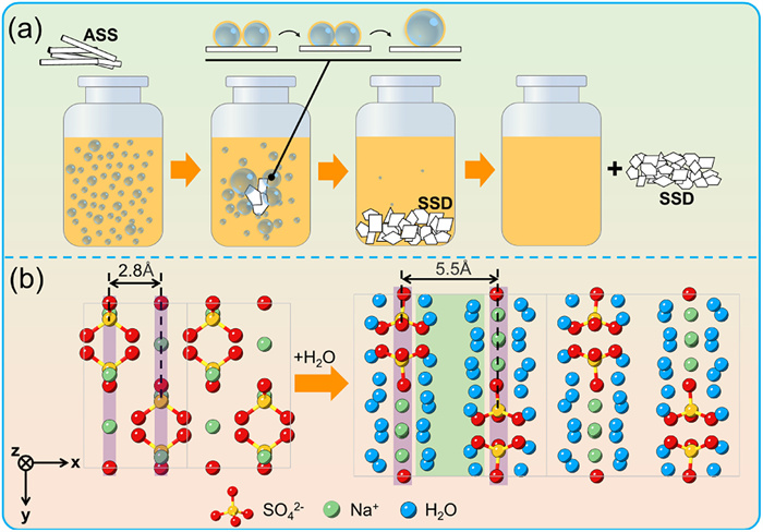 | Fig. 4. (a) Schematic illustration of the separation process of water droplets from water-in-oil emulsion after adding ASS. (b) Crystal structural transition from ASS to SSD with a view in z-direction. | |