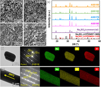 | Fig. 1. Typical SEM images (a–d) and corresponding XRD patterns (e) of the as-prepared ASS at different temperatures: (a) 150 ℃, (b) 160 ℃, (c) 170 ℃, (d) 180 ℃. Typical TEM images and corresponding EDS mapping of the as-prepared ASS150 (g) and ASS170 (f). | |