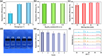 | Fig. 5. Variation of water separation efficiency with (a) dosage of ASS170, (b) volume ratio of Na2SO4 solution to EG and (c) the stirring time. And the digital image (d), separation efficiency (e) and XRD patterns (f) for the regenerated ASS170 during the five cycles of oil-water separation. | |