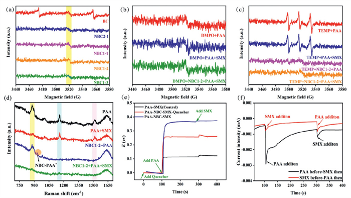 | Fig. 3. (a) EPR captures experimental results of NBC. (b) Experimental results of DMPO signal acquisition. (c) Experimental results of TEMP signal acquisition. (d) In situ Raman spectrogram. (e) OCPT test results of degradation system. (f) I-t curve test results of degradation system. Conditions: [PAA] = 3 mmol/L, NBC1-2 = 0.1 g/L, [SMX] = 10 µmol/L, and T = 23 ± 2 ℃. | |