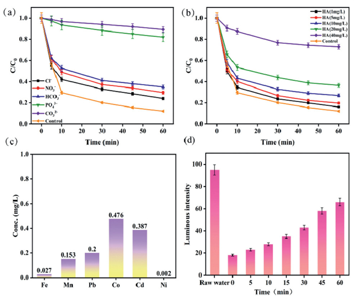 | Fig. 5. Application potential analysis of degradation system: (a) Inorganic anion interference test, (b) natural organic matter interference test, (c) TCLP leaching toxicity test of NBC. (d) Changes of luminous intensity of Vibrio fischeri in degradation system. Conditions: [PAA] = 3 mmol/L, NBC1–2 = 0.1 g/L, [SMX] = 10 µmol/L, and T = 23 ± 2 ℃. | |