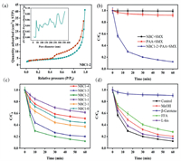 | Fig. 2. (a) Adsorption isotherm curve of NBC1-2. (b) Experiment on performance of degradation system. (c) Experimental study on degradation properties of materials with different N doping ratios. (d) The quenching experiment results. Conditions: [PAA] = 3 mmol/L, NBC1–2 = 0.1 g/L, [SMX] = 10 µmol/L, and T = 23 ± 2 ℃. | |