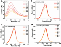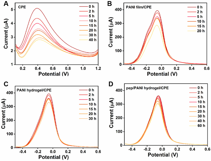 Wearable sensors designed for direct application in sweat detection must exhibit robust resistance to non-specific adsorption of contaminants in sweat. To assess the non-specific adsorption ability of the biosensor during actual detection, DPV technique was conducted to investigate signal changes for long time in various modified interfaces after immersing in artificial sweat, including bare CPE (Fig. 2A), PANI film/CPE (Fig. 2B), PANI hydrogel/CPE (Fig. 2C), and Pep/PANI hydrogel/CPE (Fig. 2D). Every cultivating time is 30 min in 100% artificial sweat. Concurrently, statistical results were presented in Fig. 3.