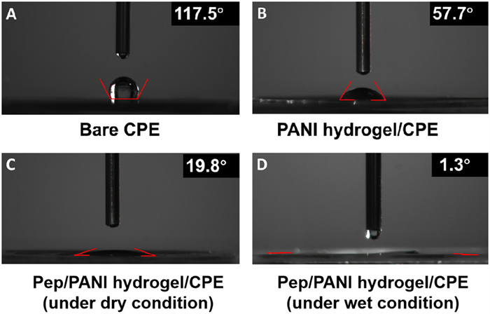 | Fig. 4. Water contact angle images of bare CPE (A), PANI hydrogel/CPE (B), Pep/PANI hydrogel/CPE under dry condition (C) and Pep/PANI hydrogel/CPE under wet condition (D). | |