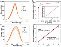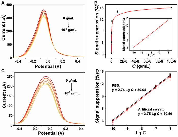 | Fig. 5. (A) DPV responses of the biosensor to target cortisol in PBS (0.2 mol/L, pH 7.0, 0 g/mL - 10–6 g/mL). (B) Signal suppression rate of the biosensor after incubation with various concentrations of cortisol in PBS. Inset showed the corresponding calibration curves. (C) DPV responses of the biosensor to target cortisol in artificial sweat. (D) The corresponding calibration curves of the biosensor after incubation with various concentrations of cortisol in PBS (black line) and in artificial sweat (red line). | |