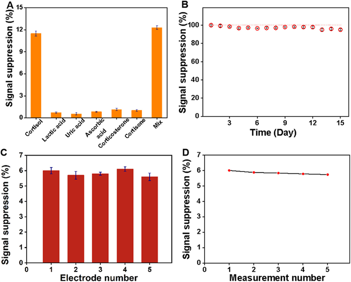 | Fig. 6. (A) Signal suppression rates of the biosensor in response to 100 ng/mL cortisol, and 500 ng/mL of LA, UA, AA, corticosterone, cortisone, as well as their mixture, respectively. (B) Stability of the fabricated biosensor after being stored in PBS (0.2 mol/L, pH 7.0) for 15 days. (C) Signal suppression rates observed with five distinct biosensors during the detection of 1.0 ng/mL cortisol. (D) Discontinuous detection of 1.0 ng/mL cortisol by a single electrode for 5 times at an interval of 30 min. | |