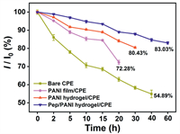 | Fig. 2. The antifouling performances of bare CPE recorded in PBS containing 5.0 mmol/L [Fe(CN)6]3-/4- and 0.1 mol/L KCl for long time after incubation in artificial sweat for 30 min, respectively (A). The antifouling performances of PANI film/CPE (B), PANI hydrogel/CPE (C), and Pep/PANI hydrogel/CPE (D) recorded in PBS (0.2 mol/L, pH 7.0) for long time after incubation in artificial sweat for 30 min, respectively. | |